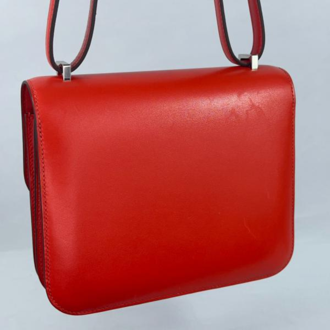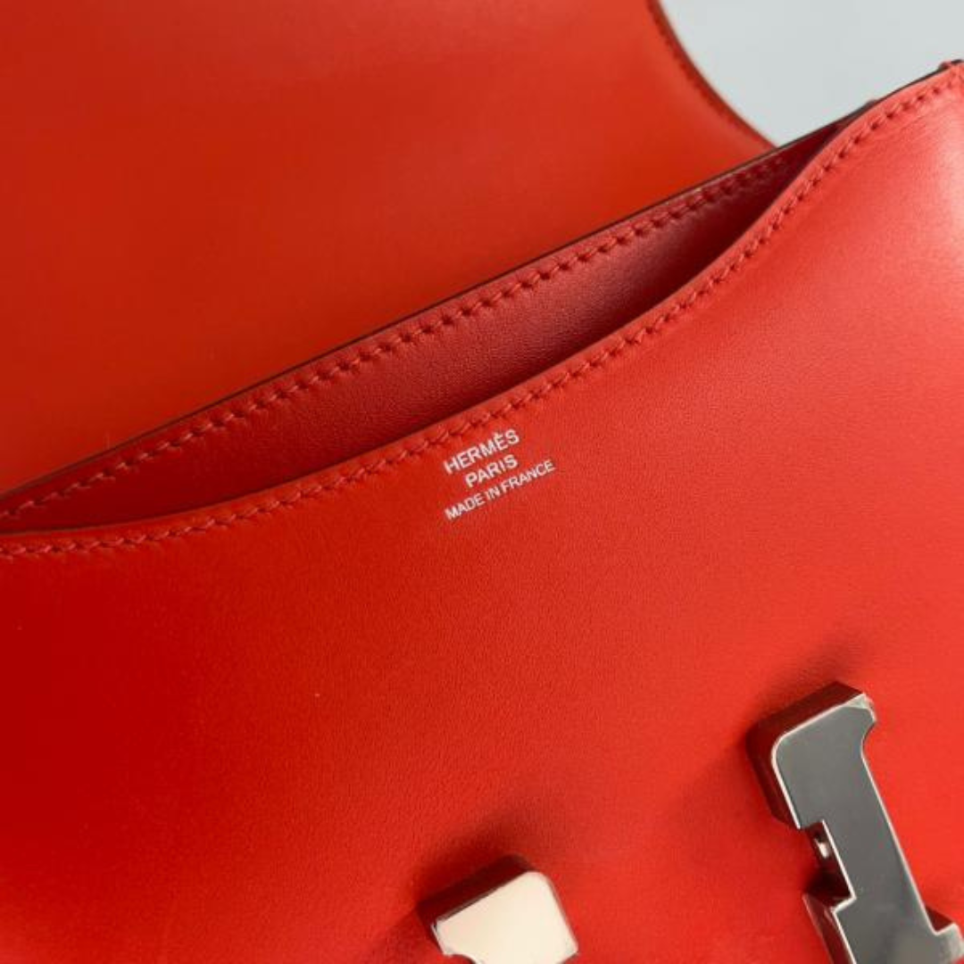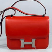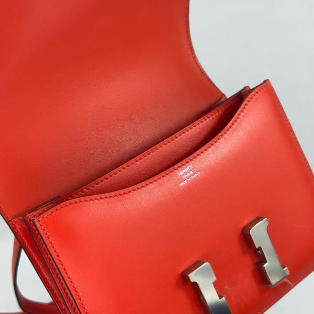 A bolsa de ombro Hermes Constance 18 é feita de Chevre Shamquila em uma cor marcante Rouge Cou B. Esta bolsa de ombro apresenta ferragens douradas e mede 15 cm de altura, 18 cm de largura e 6 cm de profundidade.