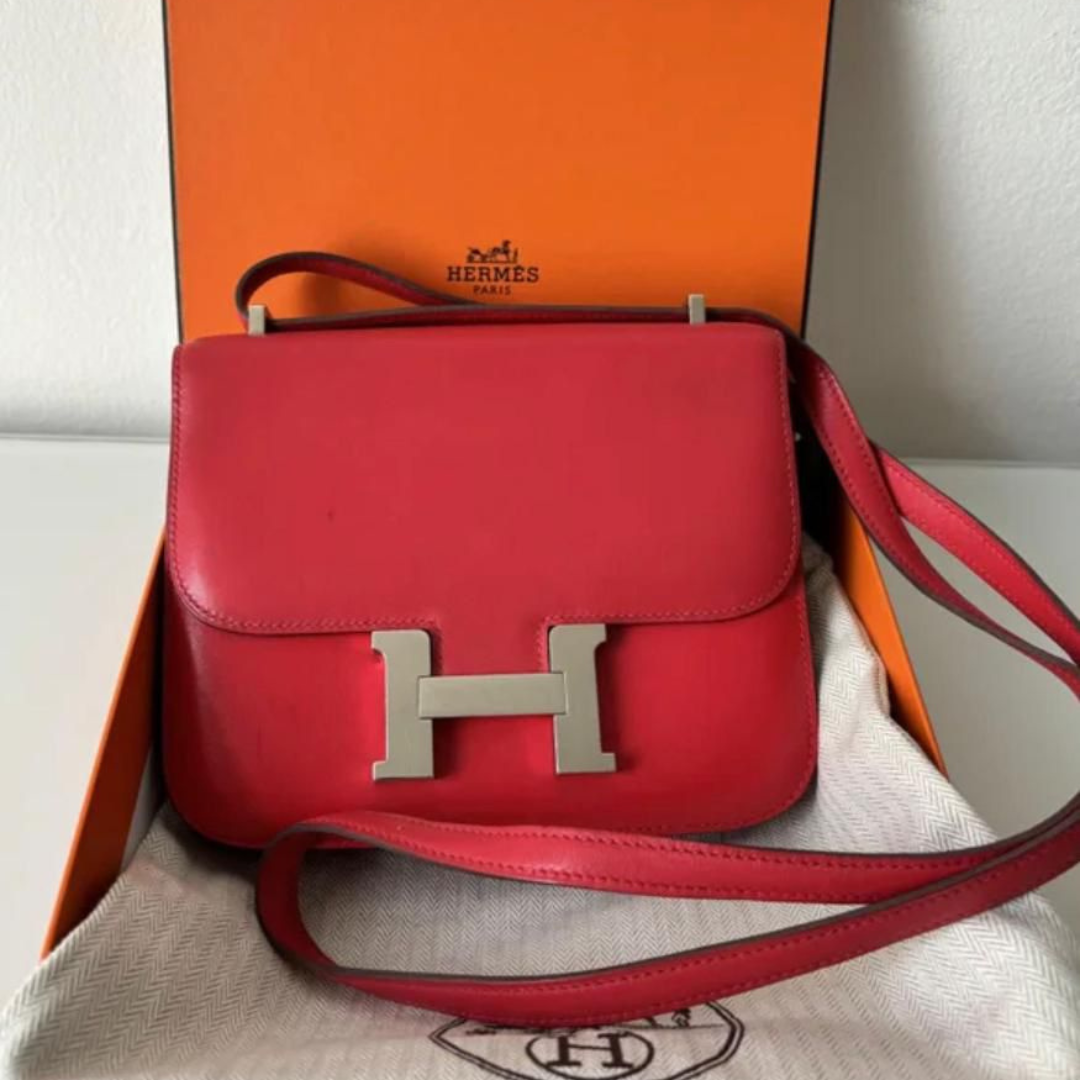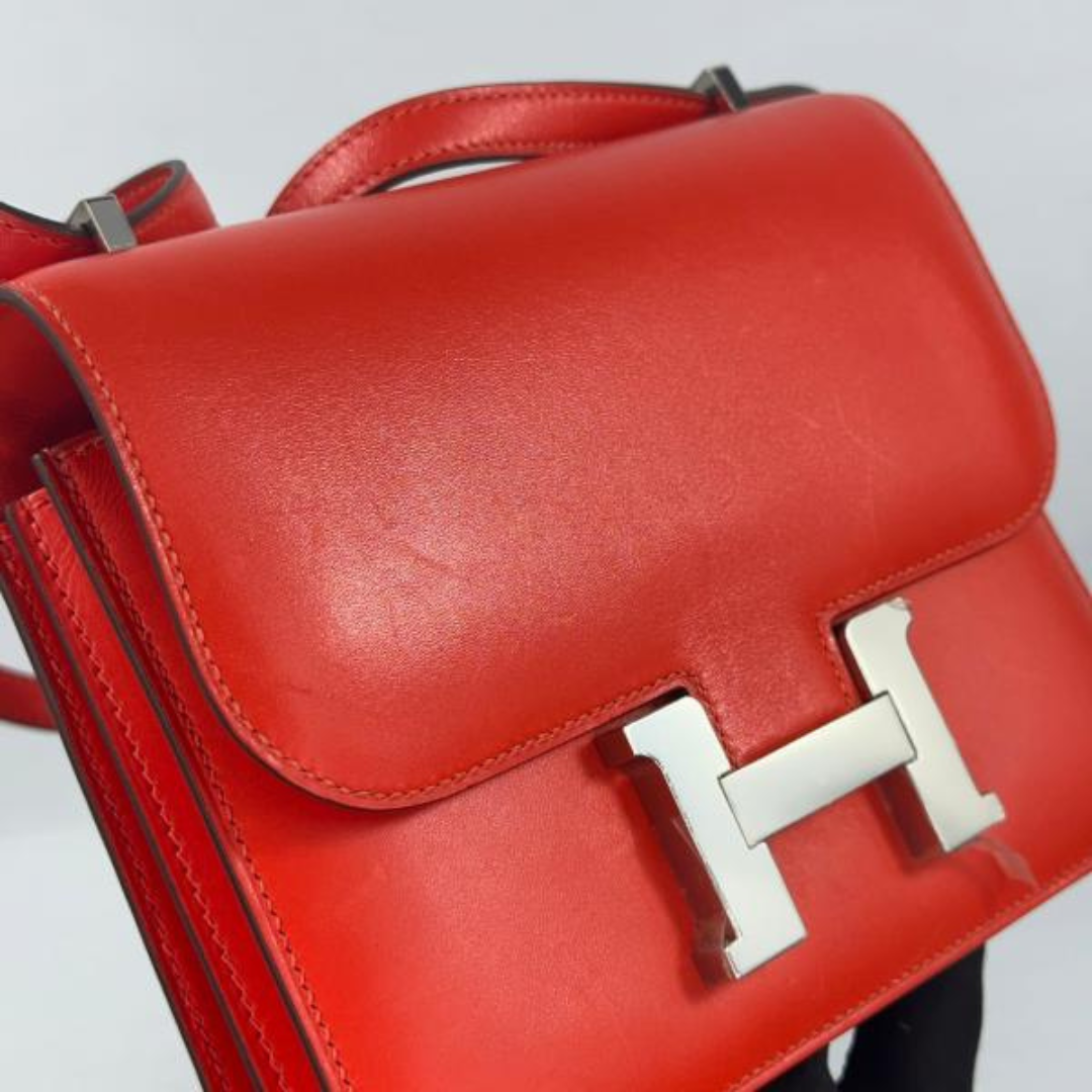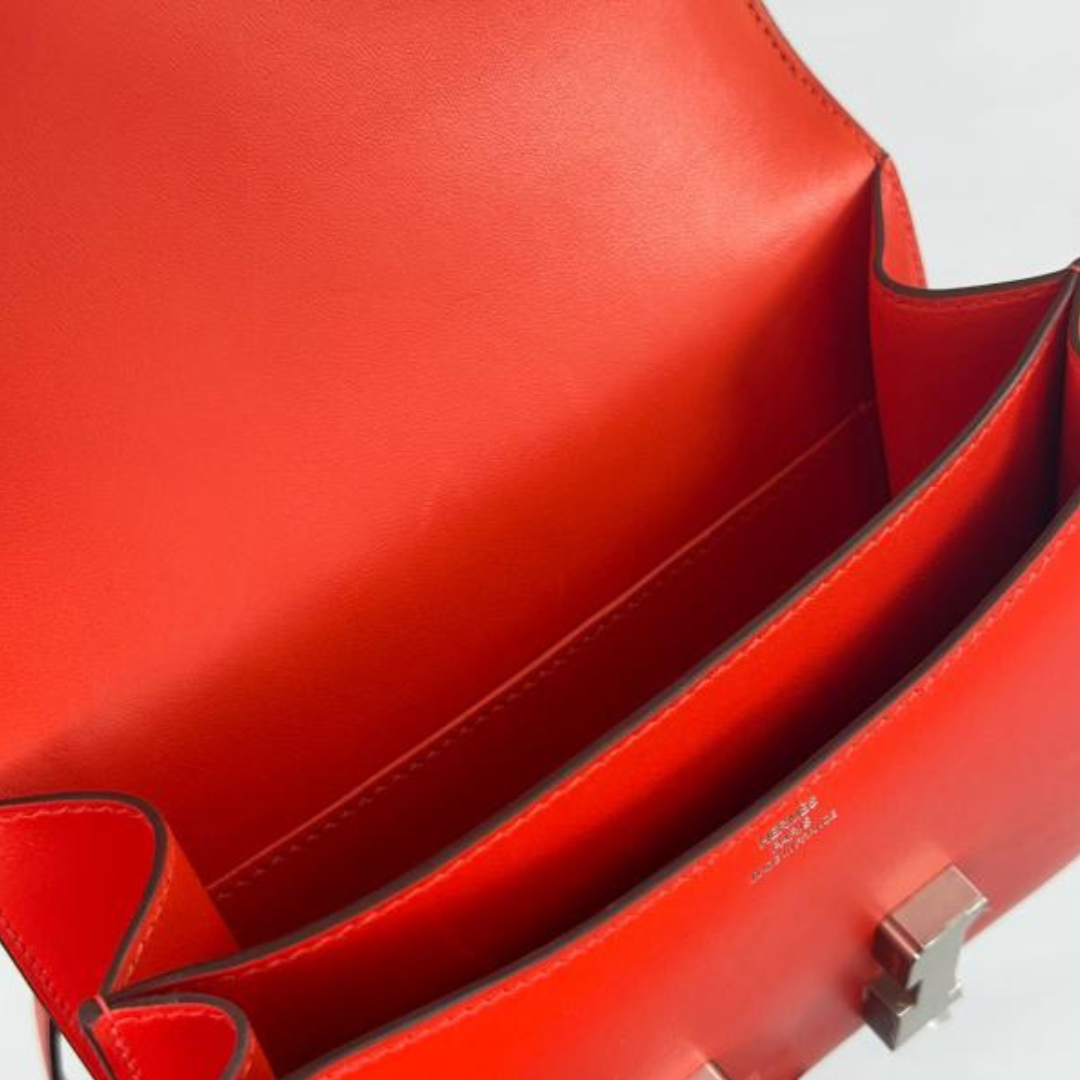A bolsa de ombro Hermes Constance 18 é feita de Chevre Shamquila em uma cor marcante Rouge Cou B. Esta bolsa de ombro apresenta ferragens douradas e mede 15 cm de altura, 18 cm de largura e 6 cm de profundidade.