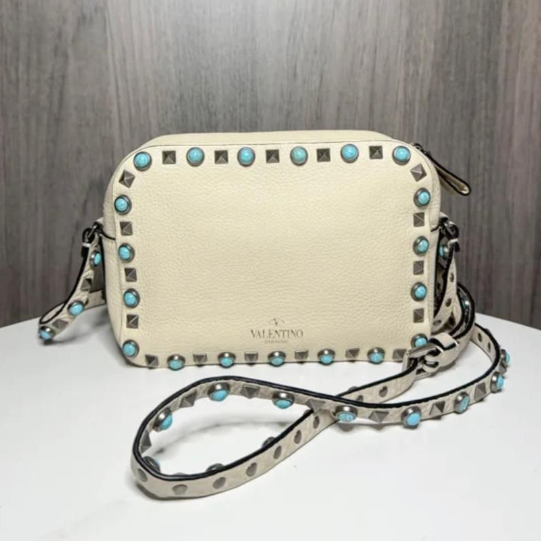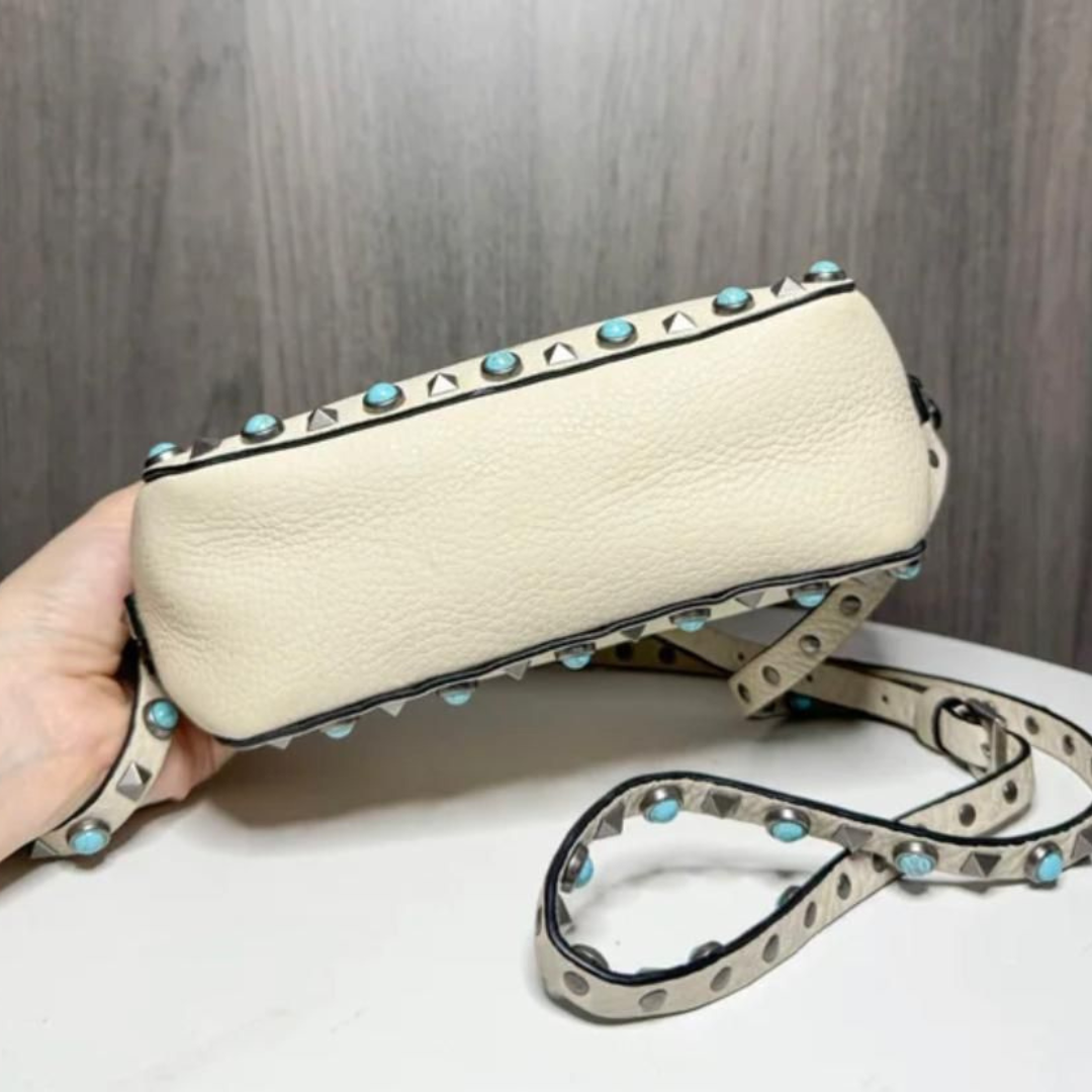 Esta sofisticada bolsa de ombro, confeccionada em couro de bezerro branco premium, exibe detalhes elegantes com tachas pretas e prateadas...