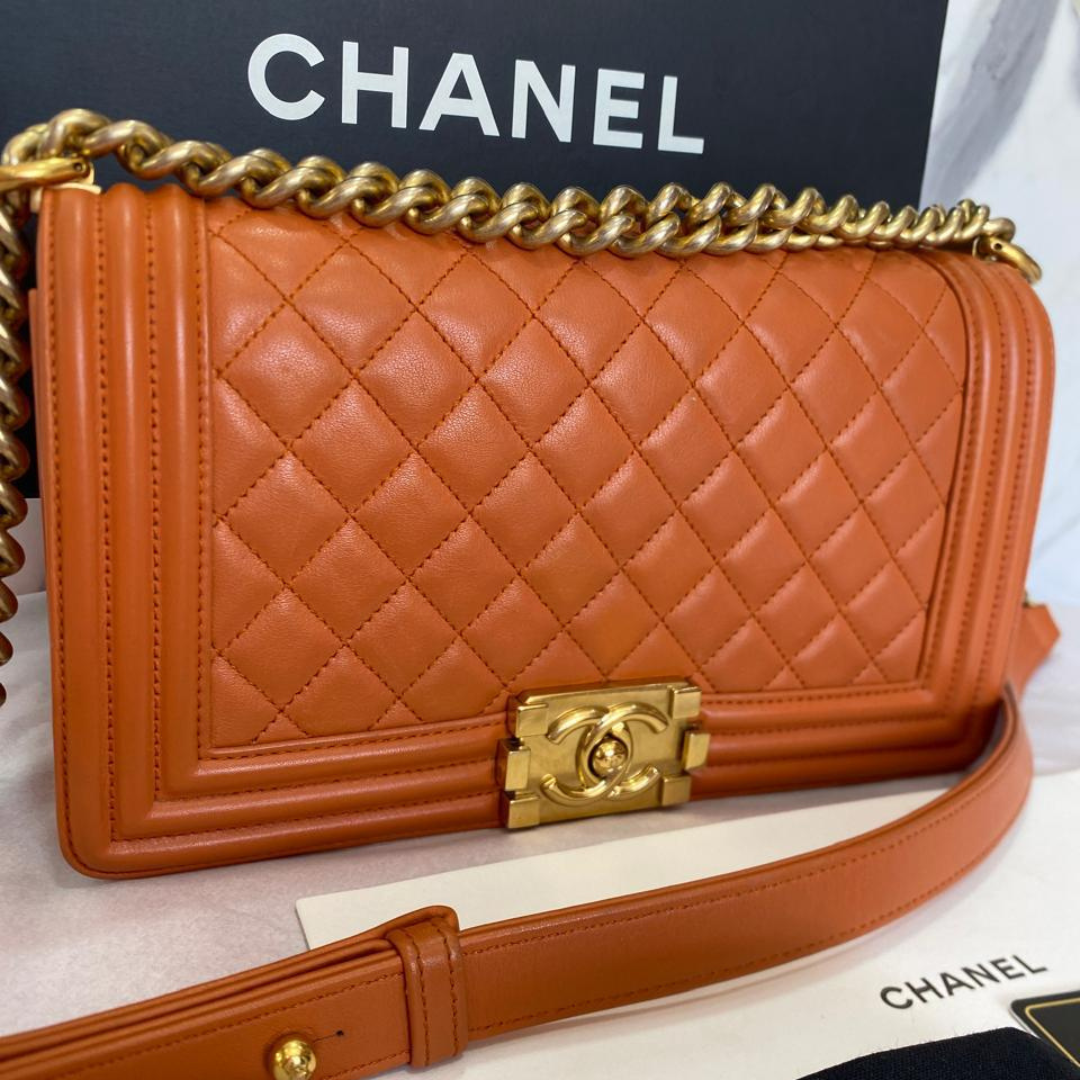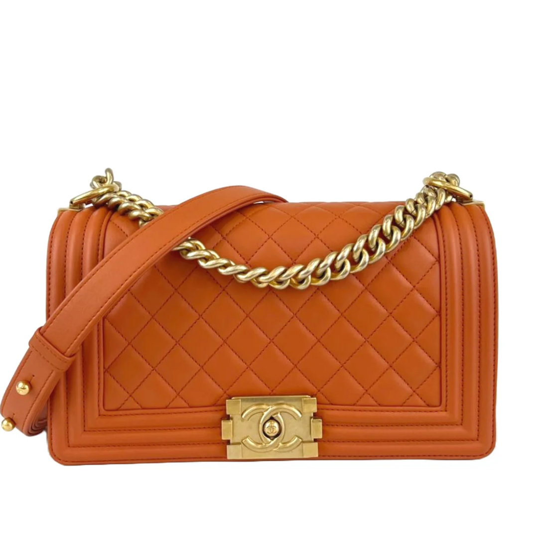 Esta é a autêntica CHANEL Lambskin Quilted Medium Boy Flap, em um sofisticado tom laranja queimado. Confeccionada em couro de cordeiro luxuoso com costura em padrão diamante, a bolsa exibe uma elegante alça de corrente em ouro envelhecido, complementada por uma ombreira em couro para maior conforto. O icônico fecho Boy Chanel CC, também em ouro envelhecido, adiciona um toque clássico. Ao abrir a aba frontal, você encontra um interior de tecido combinando e um prático bolso de remendo.