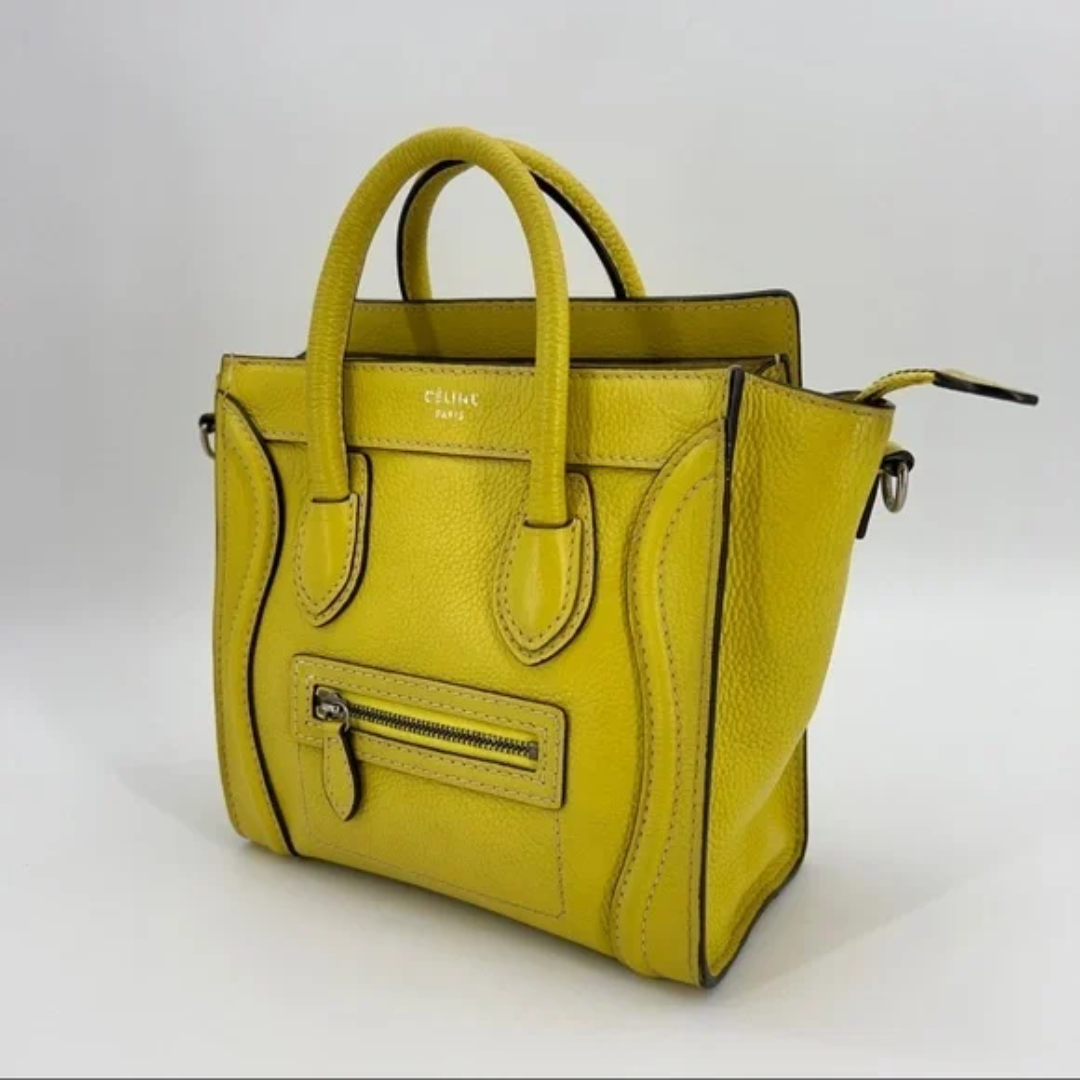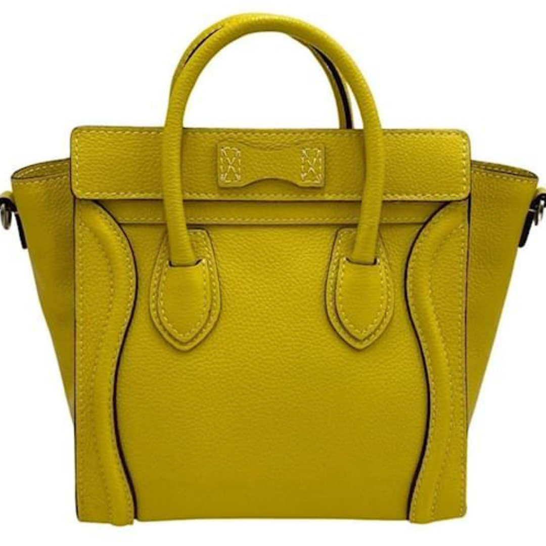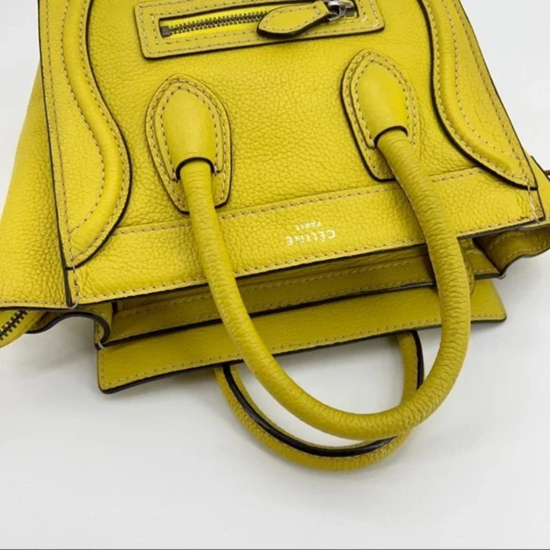 A icônica Bolsa Celine Yellow Mini Luggage é um verdadeiro sucesso e um dos modelos mais cobiçados entre as fashionistas. Confeccionada em couro amarelo, o design em formato trapézio traz sofisticação e modernidade. Possui duas alças de ombro, abertura superior com zíper e um interior aveludado espaçoso, ideal para o uso diário. Luxuosa e versátil, esta peça é perfeita para quem busca estilo e praticidade em uma única bolsa.