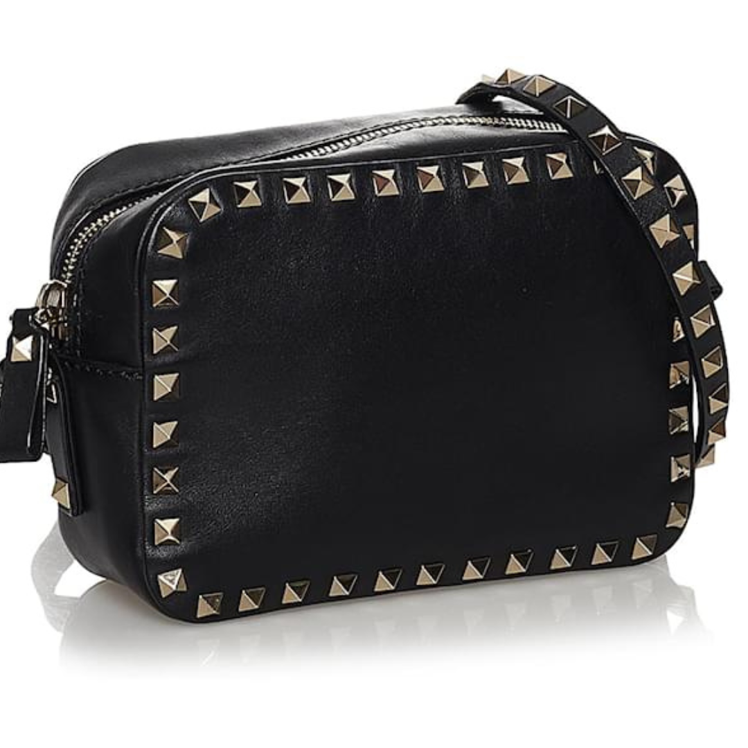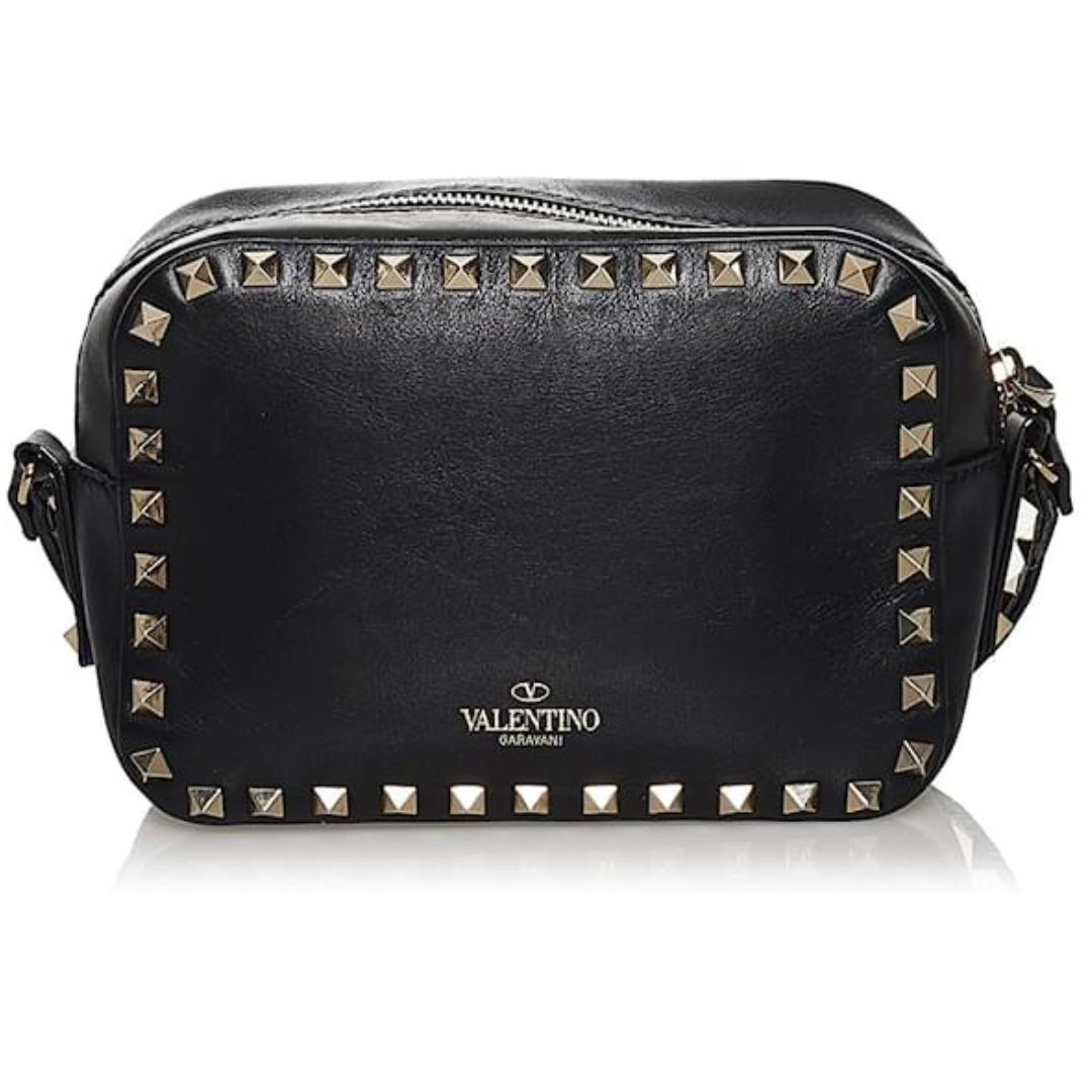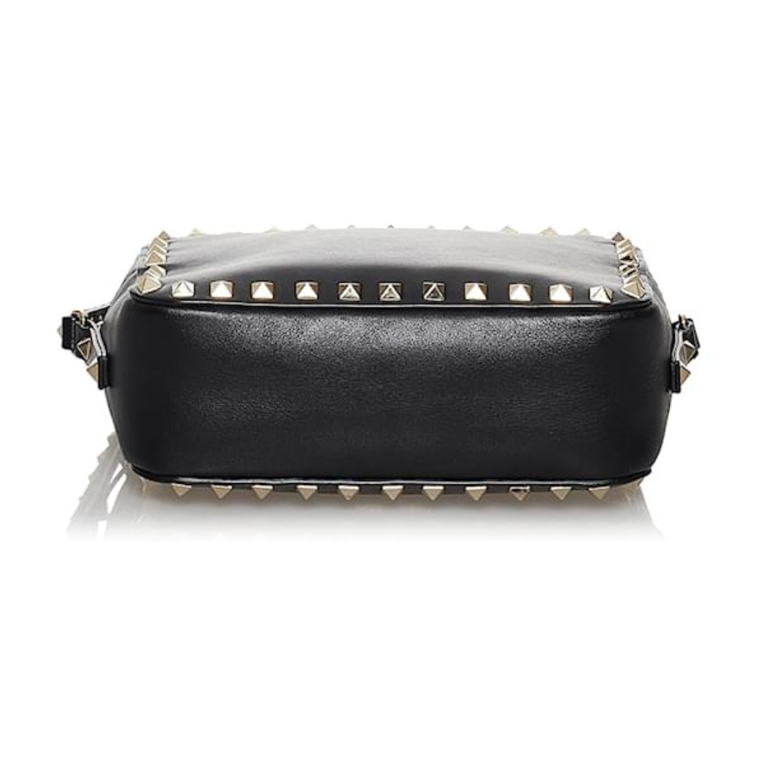 Valentino Rockstud bolsa de ombro, couro preto texturizado, logo na frente, fechamento superior com zíper, compartimento único, pequeno bolso interno de fole, tachas douradas.