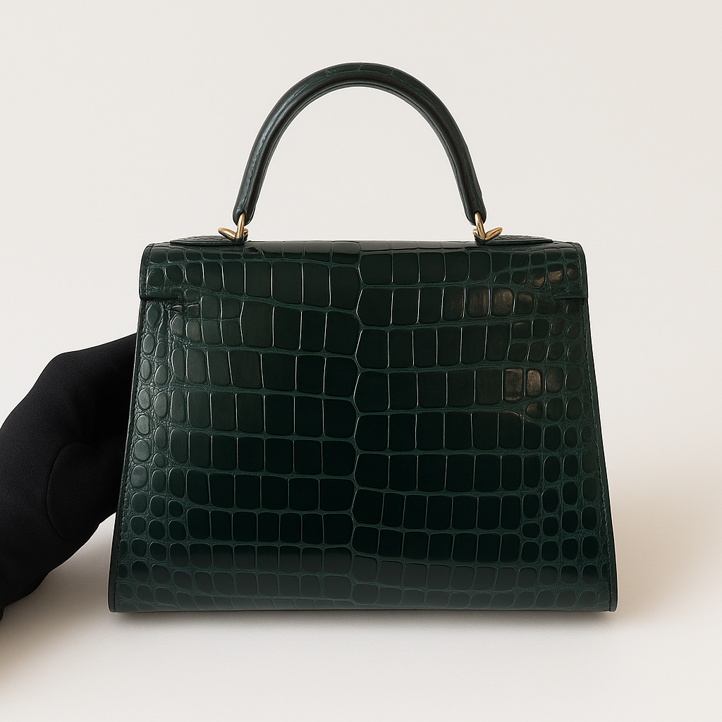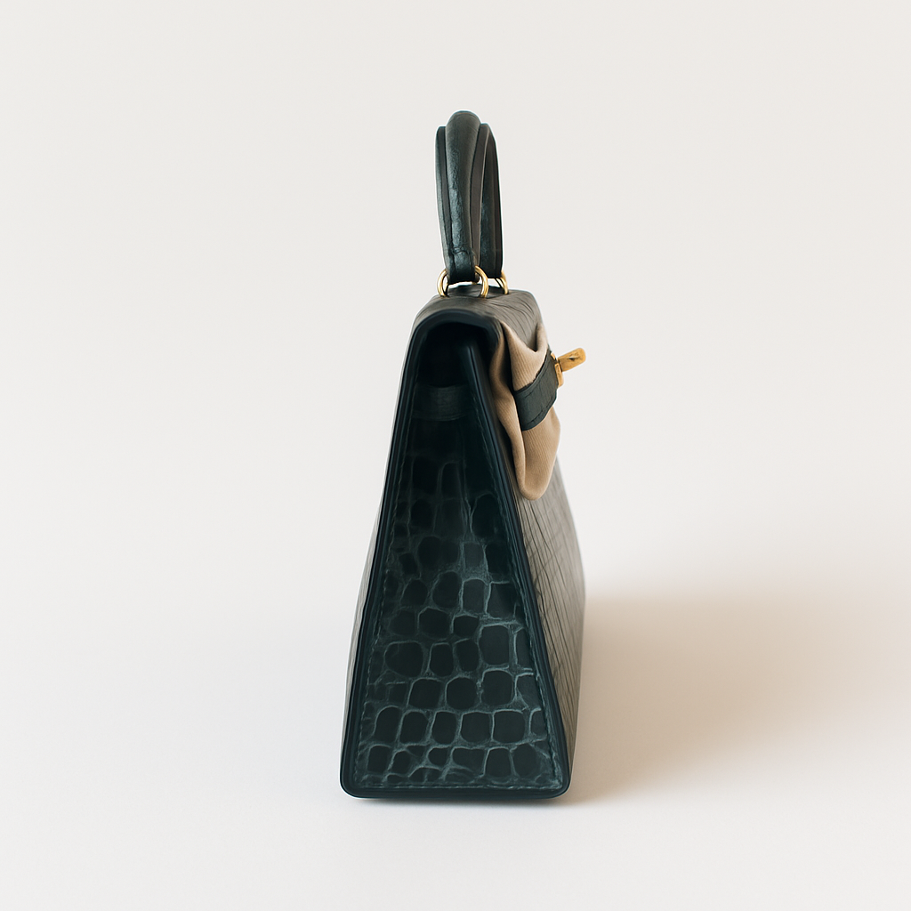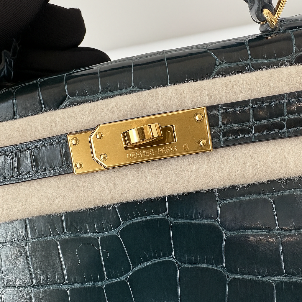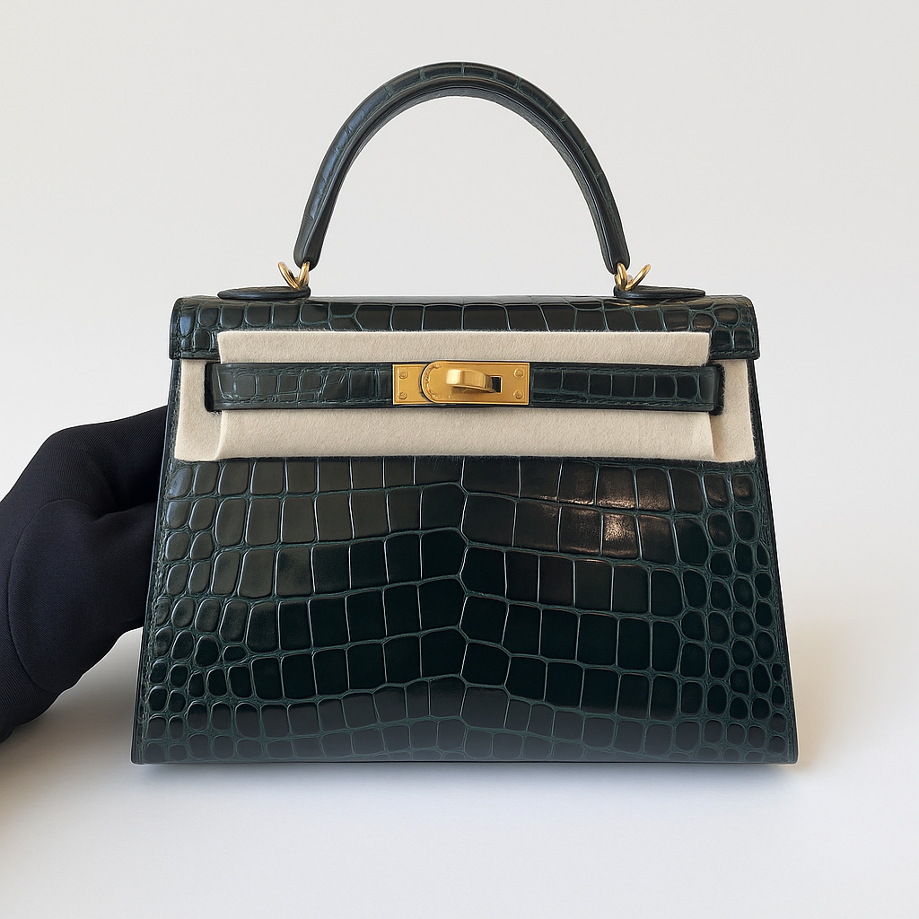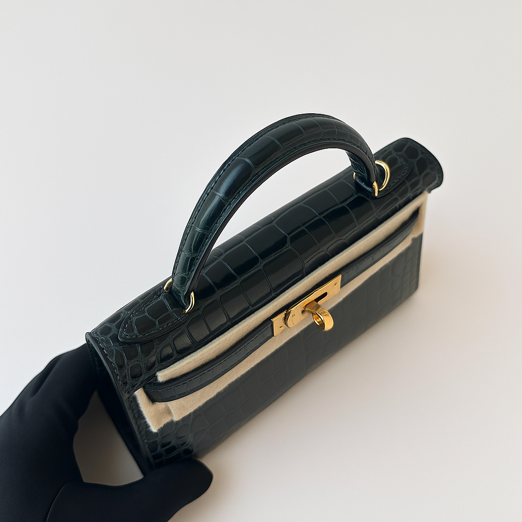 Um verdadeiro ícone de sofisticação, a Kelly Mini em couro de crocodilo é a definição de luxo atemporal. Com 20 cm, esse modelo compacto traz elegância em cada detalhe, desde a textura exótica e impecável do couro até as ferragens douradas que complementam seu design refinado.